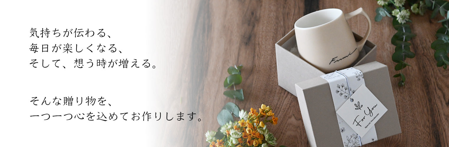 当店は、手仕事にこだわったギフト食器を販売しています。国内最大の陶磁器産地(美濃焼)より上質でセンスの良い食器をセレクトし、デザイナーが手描きで名入れなどを行いオリジナル商品をお作りしています。贈り手の想いを込めた特別なお品ですので、大切な方への贈り物にぜひご用命下さい。